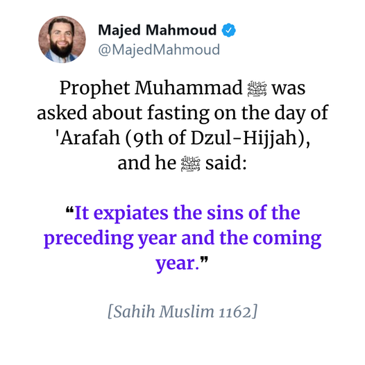 📚 Prophet Muhammad ﷺ was asked about fasting on the day of ‘Arafah, and he ﷺ said: “It expiates the sins of the preceding year and the coming year.” [Sahih Muslim 1162]