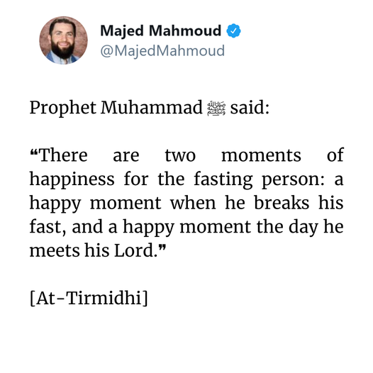 Prophet Muhammad ﷺ said: “There are two moments of happiness for the fasting person: a happy moment when he breaks his fast, and a happy moment the day he meets his Lord.” [At-Tirmidhi]