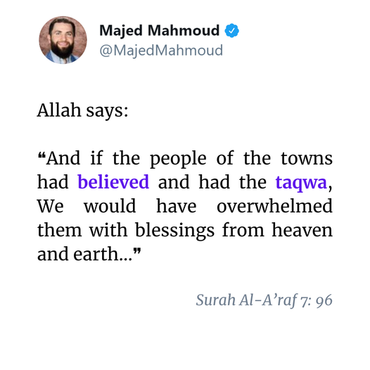 🔵 “And if the people of the towns had believed and had the taqwa, We would have overwhelmed them with blessings from heaven and earth…” [Surah Al-A’raf 7: 96] .