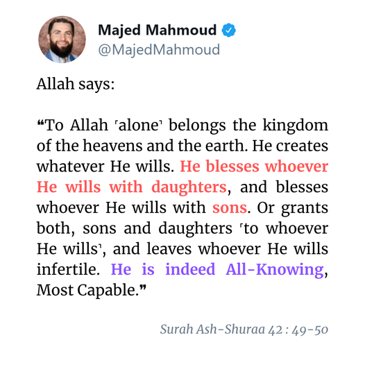 “To Allah ˹alone˺ belongs the kingdom of the heavens and the earth. He creates whatever He wills. He blesses whoever He wills with daughters, and blesses whoever He wills with sons. Or grants both, sons and daughters ˹to whoever He wills˺, and leaves whoever He wills infertile. He is indeed All-Knowing, Most Capable.” [Surah Ash-Shuraa 42 : 49-50]