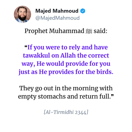 🔵 ❝If you were to rely and have tawakkul on Allah the correct way, He would provide for you just as He provides for the birds. They go out in the morning with empty stomachs and return full.❞ [Al-Tirmidhi 2344]