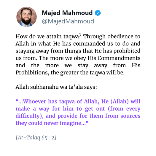 🔵 ❝…Whoever has taqwa of Allah, He (Allah) will make a way for him to get out (from every difficulty), and provide for them from sources they could never imagine…❞ [At-Talaq 65 : 2]