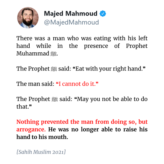 This hadith mentioned that the man disrespected and refused to obey Prophet Muhammad ﷺ out of arrogance. Thus from that moment onwards, he was never able to lift his right hand to eat with it. This is an important lesson for us to not respond in arrogance towards the Qur’an, the hadith or the sunnah of Prophet Muhammad ﷺ.