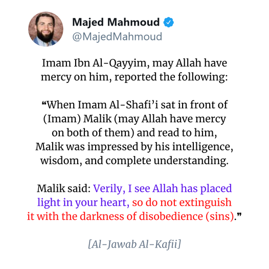 🔵 ❝When Imam Al-Shafi’i sat in front of (Imam) Malik (may Allah have mercy on both of them) and read to him, Malik was impressed by his intelligence, wisdom, and complete understanding. Malik said: Verily, I see Allah has placed light in your heart, so do not extinguish it with the darkness of disobedience (i.e. sins).❞ [Al-Jawab Al-Kafii]