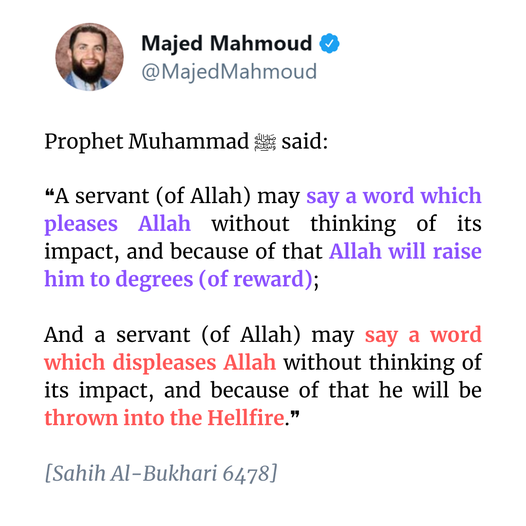 📚 Prophet Muhammad ﷺ said: “A servant (of Allah) may say a word which pleases Allah without thinking of its impact, and because of that Allah will raise him to degrees (of reward); And a servant (of Allah) may say a word which displeases Allah without thinking of its impact, and because of that he will be thrown into the Hellfire.”” [Sahih Al-Bukhari 6478]