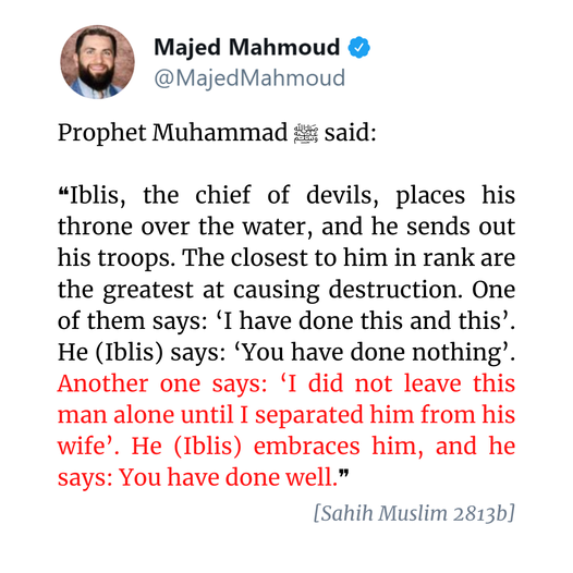 It’s recorded in Sahih Muslim 2813, that Prophet Muhammad ﷺ said that Iblis gathers his troops to see what damage they’ve done. One shaytan comes & says: “I have influenced a person to do such & such sin.” But Iblis doesn’t find this impressive enough & says: “You’ve done nothing!” until one shaytan comes & says: “I did not let go of this man (meaning, this process took a long time!) until I was able to separate (divorce) him from his wife.” When Iblis hears about this, he embraces that shaytan & says: “You have done well!” Indeed, the greater the destruction a shaytan does, the greater the recognition that shaytan will get from their master – Iblis.