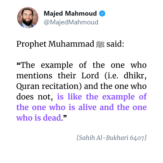 🔵 Prophet Muhammad ﷺ said: “The example of the one who mentions their Lord (i.e. dhikr of Allah, and the greatest of dhikr of Allah is the Qur’an) and the one who does not, is like the example of the one who is alive and the one who is dead.” [Sahih Al-Bukhari 6407]