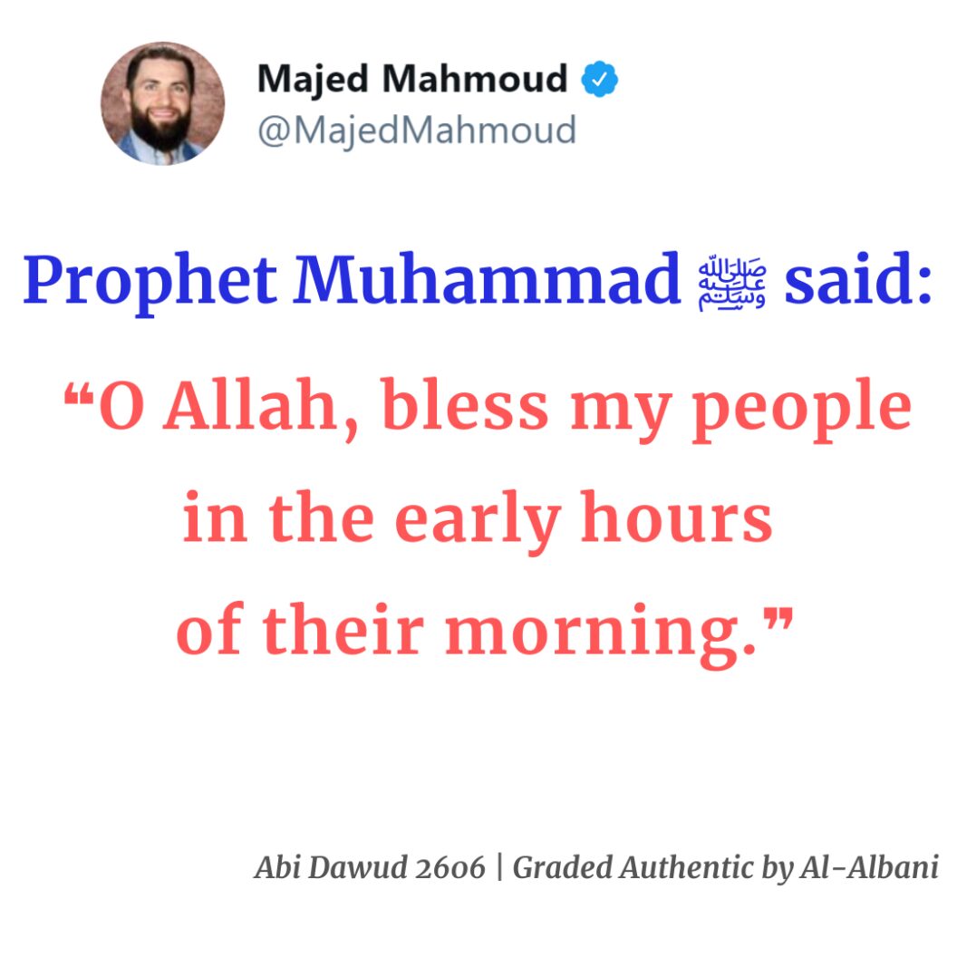 🔵 “O Allah, bless my ummah (nation) during the early hours of the day.” [Abi Dawud 2606 | Graded Authentic by Al-Albani]