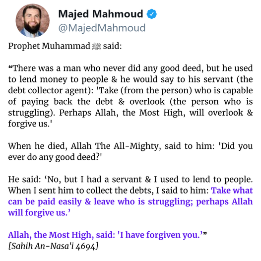 Prophet Muhammad ﷺ said that there was a man who hardly did anything good in his life. Hardly! But he was wealthy, so he used to give loans to people. He hired someone to collect his money when it’s due to be repaid. He advised his assistant: If you met any debtor struggling to pay back the money, then take only what the debtor can pay easily, and leave what is difficult, perhaps because of this Allah will forgive us.