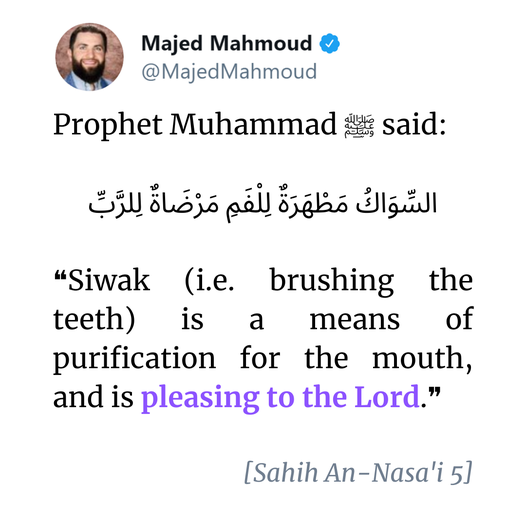 🔵 “Siwak (i.e. brushing the teeth) is a means of purification for the mouth, and is pleasing to the Lord.” [Sahih An-Nasa’i 5]