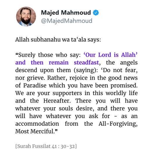 “Surely those who say: ‘Our Lord is Allah’ & then remain steadfast, the angels descend upon them (saying): ‘Do not fear, nor grieve. Rather, rejoice in the good news of Paradise which you have been promised. We are your supporters in this worldly life & the Hereafter. There you will have whatever your souls desire & there you will have whatever you ask for – as an accommodation from the All-Forgiving, Most Merciful.” [Surah Fussilat 41 : 30-32]