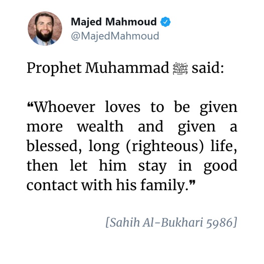 Prophet Muhammad ﷺ said: “Whoever loves to be given more wealth and given a blessed, long (righteous) life, then let him stay in good contact with his family.” [Sahih Al-Bukhari 5986]