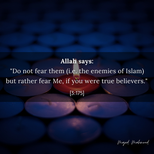 The fear of Allah should drive us towards the worship of Allah. Do not fear th… The fear of Allah should drive us towards the worship of Allah. Do not fear the enemies of Islam for they do not have anyone to help them whereas the believers have Allah. Share it with your friends:Like this:Like Loading... View more from Majed Mahmoud