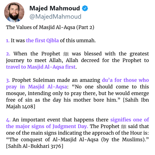 Do you now see the honor of Masjid Al-Aqsa? When someone asks “Why are the Muslims so upset about what’s happening there?” I want you to be sure that one of the top reasons you’re going to mention is: “I’m angry for the sake of Allah, because my faith tells me to be upset about what’s happening there.” This is from the sign of taqwa & iman. May Allah make us believers who honor Al-Masjid Al-Aqsa, ameen.