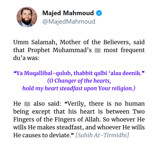 It was: Ya Muqallibal-qulub, thabbit qalbi ‘alaa deenik. Meaning: O Changer of the hearts, hold my heart steadfast upon Your religion.” [Sahih At-Tirmidhi]