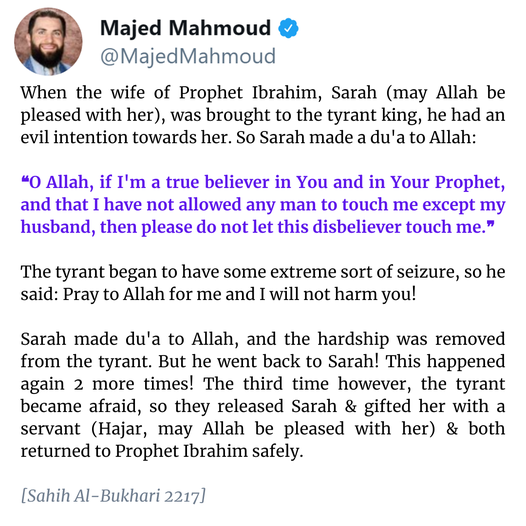 So Allah removed the hardship from the tyrant. But when the tyrant returned to normal, what did he do? He went back to Sarah! This happened again 2 more times! Each time Sarah made du’a to Allah for protection & each time the tyrant got inflicted with seizure, he’d beg Sarah to pray for him & that he wouldn’t harm her, but he would go back on his words. The third time however, the tyrant said to his soldier: You have not brought me a human, but a devil!